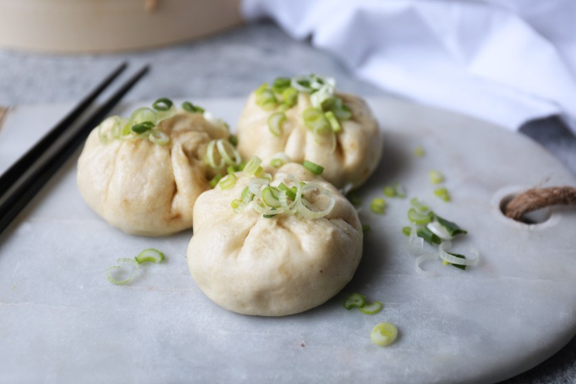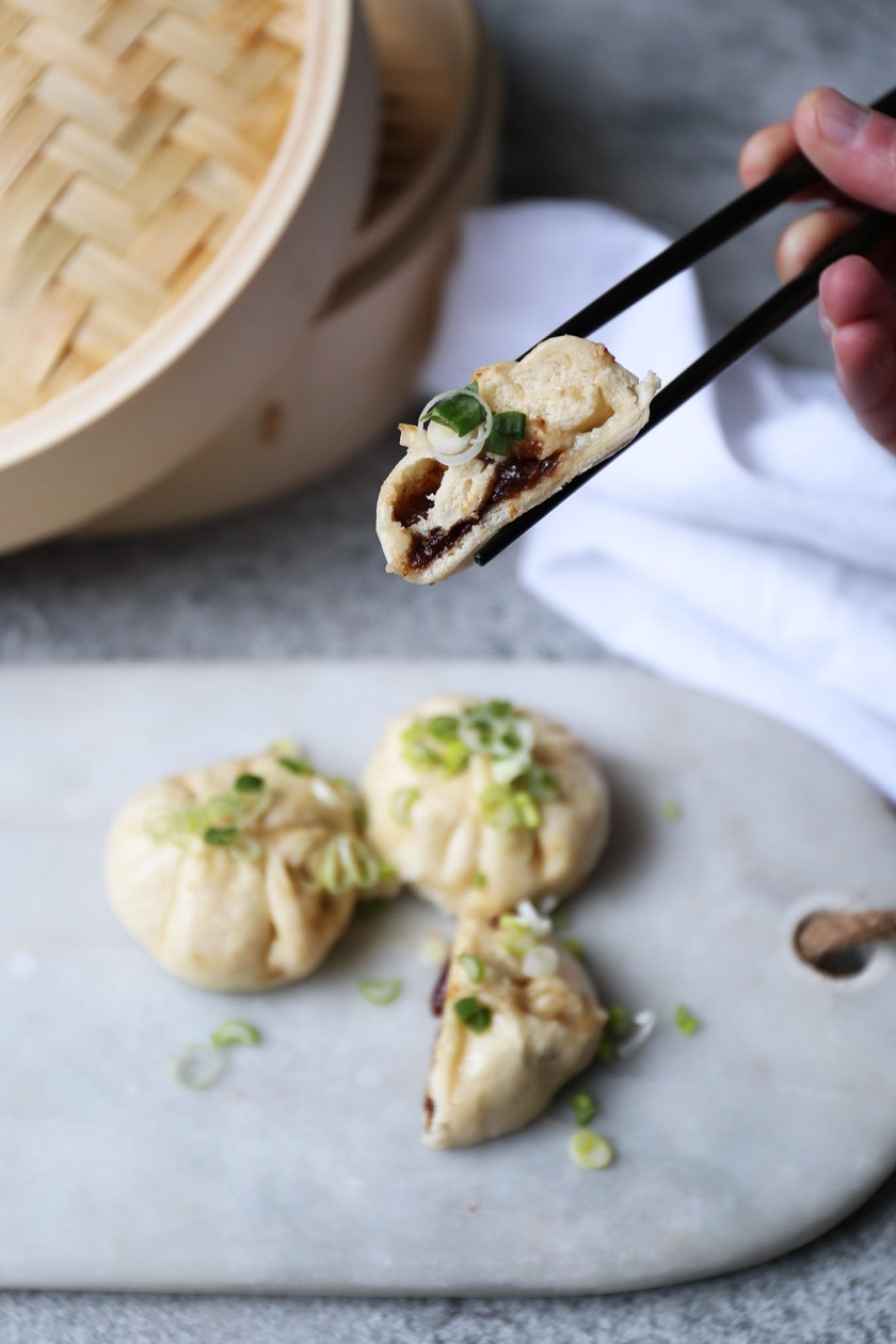 3. Bánh bao: Den Teig in golfballgroße Kugeln formen, danach gleichmäßig flach ausrollen. Das Feigenchutney und ein kleines Stück vom Gorgonzola in die Mitte der Kreise legen, danach den Teig in kleinen Falten einmal komplett herum nach oben ziehen und die Enden fest zusammendrücken. Nun die fertigen Bánh bao in den Bambusdämpfer legen und über heißem Wasser 20 Minuten dämpfen. Vorsichtig herausnehmen und mit der fein gehackten Frühlingszwiebel garnieren.
