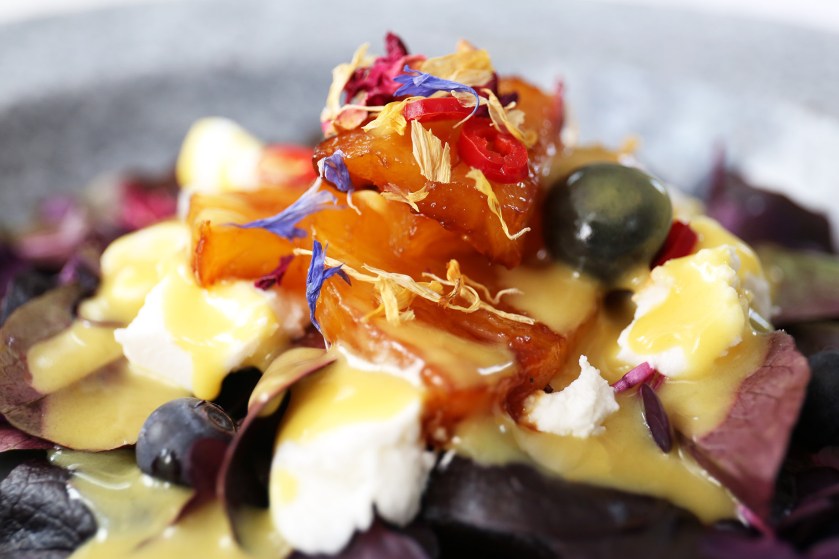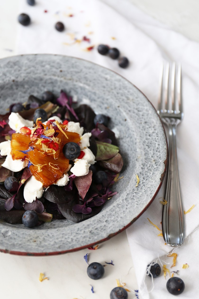 3. Fertigstellung: Den Feldsalat zuerst auf die Teller geben, danach den zerkrümelten Ziegenfrischkäse auf den Salat geben, anschließend die Blaubeeren. Nun die heiße Ananas oben auf den Frischkäse legen. Mit Dressing beträufeln, fertig :)