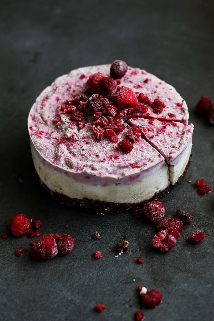 2. Nun alle Zutaten für die Creme in den Standmixer geben und mehrere Minuten fein pürieren bis eine seidige Masse entstanden ist. Nun 3/4 der Masse auf den Boden geben und glatt streichen. Zu der restlichen Creme im Standmixer nun gefrorene Himbeeren geben und noch einmal kurz pürieren.