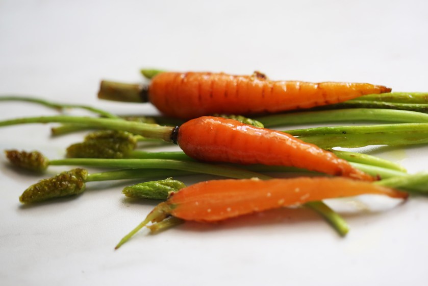 2. Am nächsten Tag für ca. 30 Minuten in leicht gesalzenem Wasser kochen. Währenddessen habe ich die Rote Beete in dünne Scheiben geschnitten, in einer Pfanne leicht angeröstet, den Wildspargel mit etwas Kokosöl angebraten und die Möhrchen in Ahornsirup glasiert.