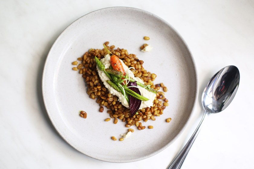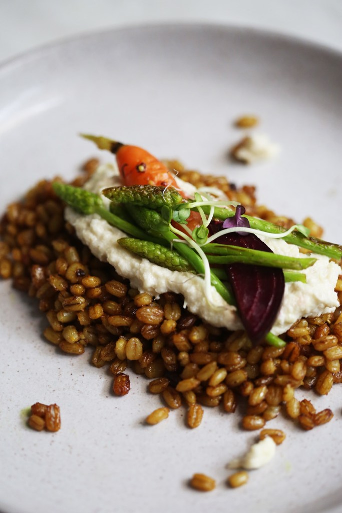 4. Während die Graupen anbraten, wird die Creme vorbereitet. Einfach die Artischocken mit dem Meerrettich in einen Mixer geben und fein pürieren. Nun die angebratenen Graupen auf einen Teller geben, mit der Creme bestreichen und das Gemüse oben auf garnieren, fertig :)