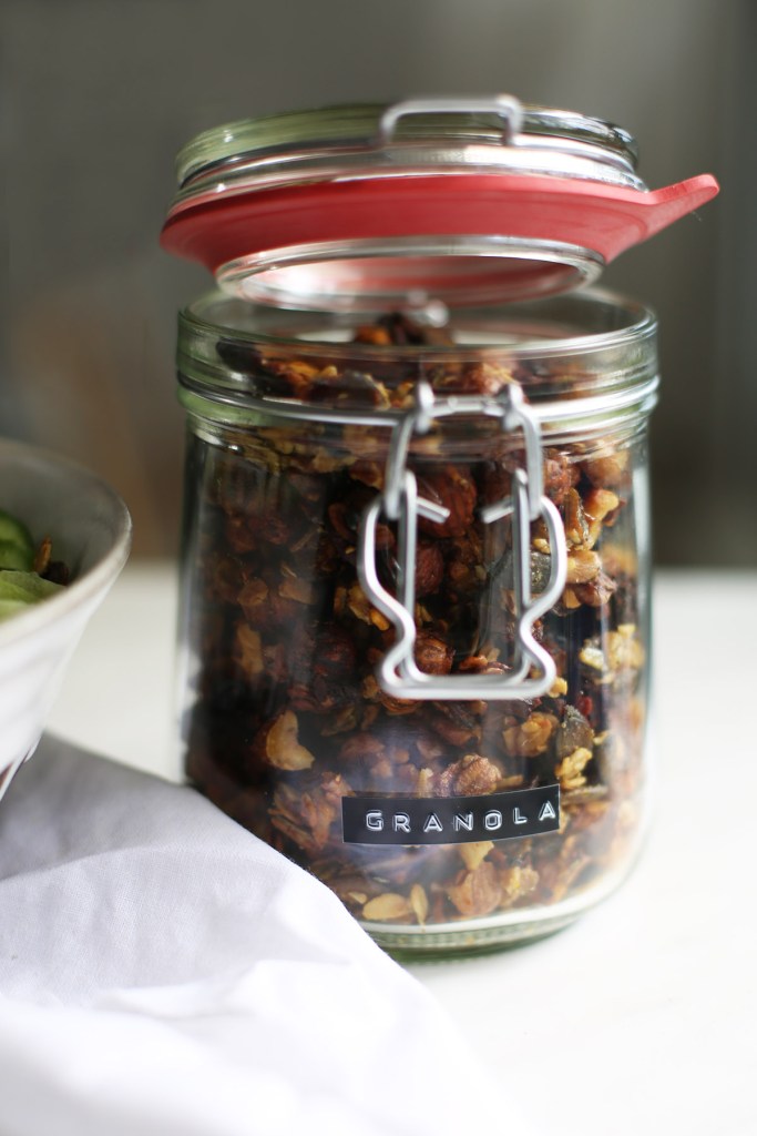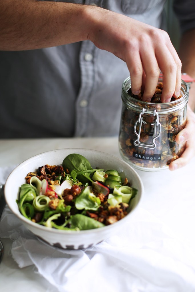 Abends essen wir relativ häufig Salat. Er geht schnell, ist nicht zu schwer und schmeckt uns beiden gut. Damit das nicht zu langweilig wird, mache ich immer gerne verschiedene Toppings dazu. Zur Zeit haben wir immer dieses Senf-Granola oben auf unseren Salat gegeben. Es macht das Ganze noch etwas deftiger, gibt einen gewissen Biss dazu und schmeckt einfach super lecker. Dieses Granola kann man von den Nüssen her variieren wie man mag, wichtig ist hierbei, die Nüsse (Haselnüsse) etwas aufzubrechen, sonst werden sie im Ofen zu kleinen tickenden Zeitbomben. Ich bin generell ein großer Fan von Senf, bin mir aber sicher, dass das Ganze auch super mit Meerrettich schmecken könnte. Probiert es doch einfach einmal aus :)