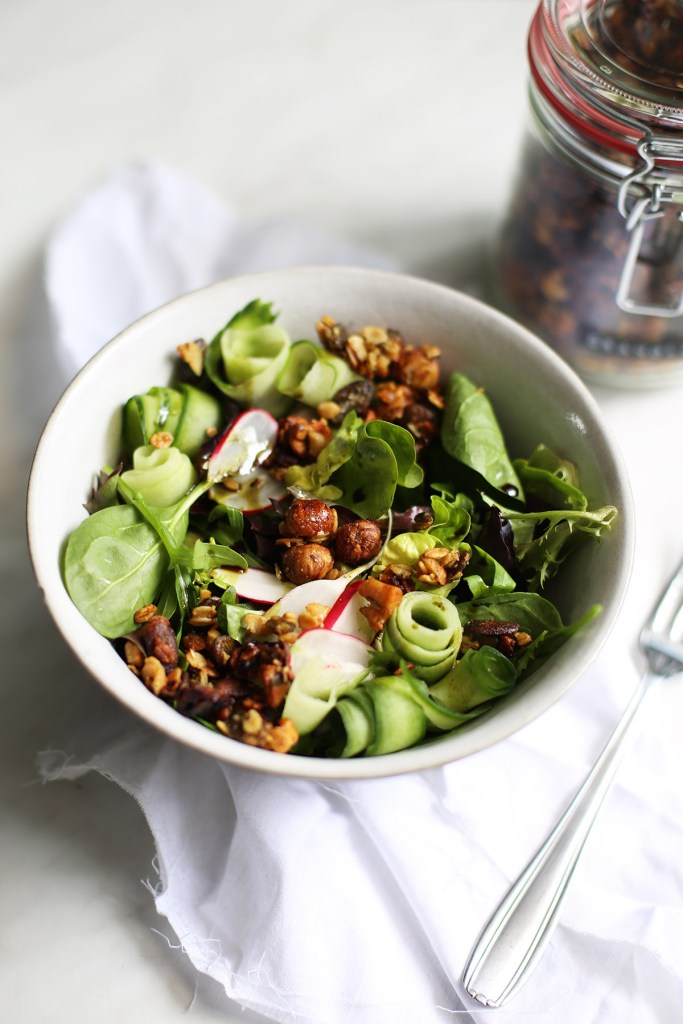 Abends essen wir relativ häufig Salat. Er geht schnell, ist nicht zu schwer und schmeckt uns beiden gut. Damit das nicht zu langweilig wird, mache ich immer gerne verschiedene Toppings dazu. Zur Zeit haben wir immer dieses Senf-Granola oben auf unseren Salat gegeben. Es macht das Ganze noch etwas deftiger, gibt einen gewissen Biss dazu und schmeckt einfach super lecker. Dieses Granola kann man von den Nüssen her variieren wie man mag, wichtig ist hierbei, die Nüsse (Haselnüsse) etwas aufzubrechen, sonst werden sie im Ofen zu kleinen tickenden Zeitbomben. Ich bin generell ein großer Fan von Senf, bin mir aber sicher, dass das Ganze auch super mit Meerrettich schmecken könnte. Probiert es doch einfach einmal aus :)