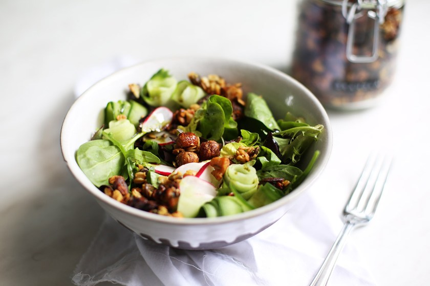 Abends essen wir relativ häufig Salat. Er geht schnell, ist nicht zu schwer und schmeckt uns beiden gut. Damit das nicht zu langweilig wird, mache ich immer gerne verschiedene Toppings dazu. Zur Zeit haben wir immer dieses Senf-Granola oben auf unseren Salat gegeben. Es macht das Ganze noch etwas deftiger, gibt einen gewissen Biss dazu und schmeckt einfach super lecker. Dieses Granola kann man von den Nüssen her variieren wie man mag, wichtig ist hierbei, die Nüsse (Haselnüsse) etwas aufzubrechen, sonst werden sie im Ofen zu kleinen tickenden Zeitbomben. Ich bin generell ein großer Fan von Senf, bin mir aber sicher, dass das Ganze auch super mit Meerrettich schmecken könnte. Probiert es doch einfach einmal aus :)  Zutaten (für ein großes Einmachglas): 1 handvoll Haselnüsse 1 handvoll Sonnenblumenkerne 1 handvoll Walnüsse 1 handvoll Kürbiskerne 1 handvoll Haferflocken 4 EL Senf (mittelscharf) 4 EL Kokosöl (geschmolzen) 1 Prise Salz 1 TL Curry 1. Alle Zutaten zusammen in einer großen Schüssel vermischen bis alle Nüsse mit einer Schicht der Senfmasse ummantelt sind. Auf einem großen Backblech verteilen und …